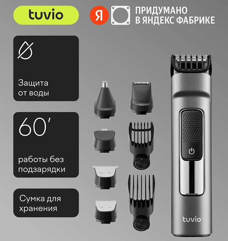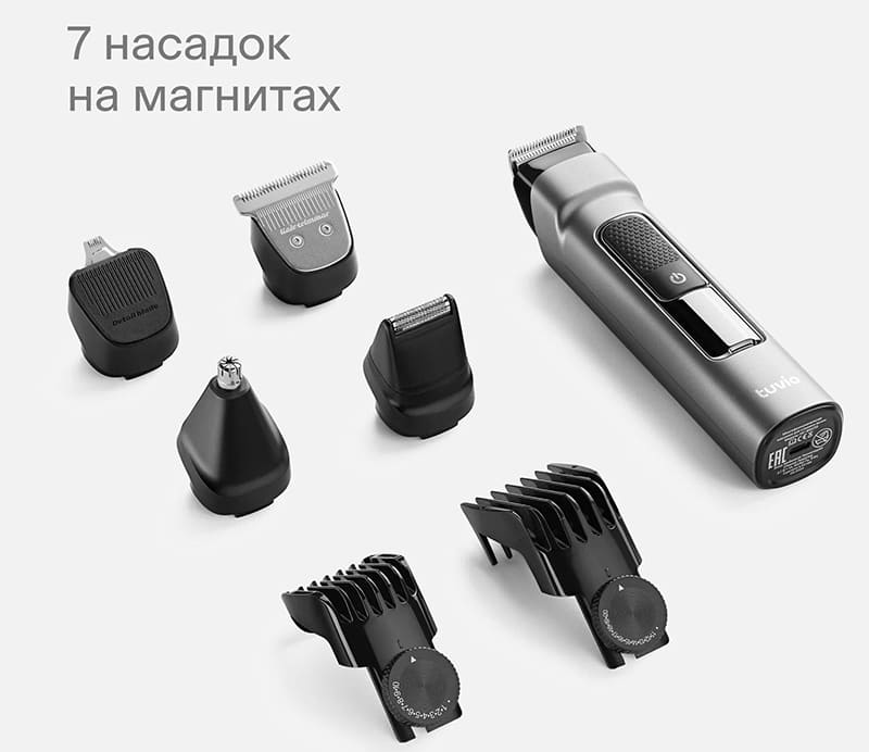 Машинка для стрижки волос Tuvio HC-BGA7G — беспроводное устройство с семью магнитными насадками, которое позволяет стричь волосы, корректировать бороду и усы, а также удалять волосы в носу и ушах. Все насадки фиксируются магнитами, что упрощает смену и исключает необходимость защелкивать их в пазы. Ножевой блок выполнен из нержавеющей стали и состоит из двух частей: движущейся и неподвижной. Ширина режущей поверхности составляет 32 мм, что позволяет охватывать достаточно большую площадь за один проход. Минимальная длина стрижки без насадок — 1 мм, что соответствует едва заметной щетине. Мотор работает от аккумулятора и обеспечивает постоянную скорость вращения ножа до 6000 оборотов в минуту, независимо от уровня заряда.