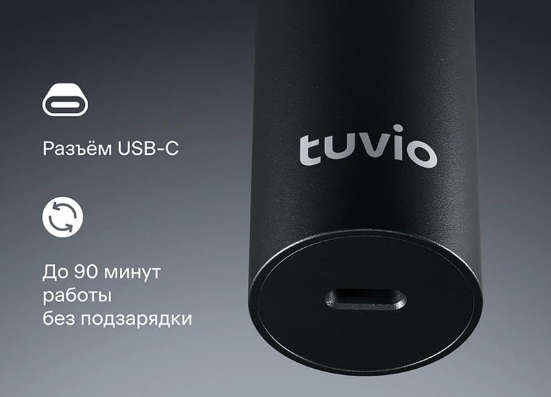 Встроенный литий-ионный аккумулятор обеспечивает до 90 минут непрерывной работы на одной зарядке. Полный цикл зарядки занимает 90 минут при подключении к сетевому адаптеру через кабель USB-C. Для удобства пользователей на корпусе расположен световой индикатор зарядки: красный свет указывает на процесс зарядки, зеленый — на полный заряд.