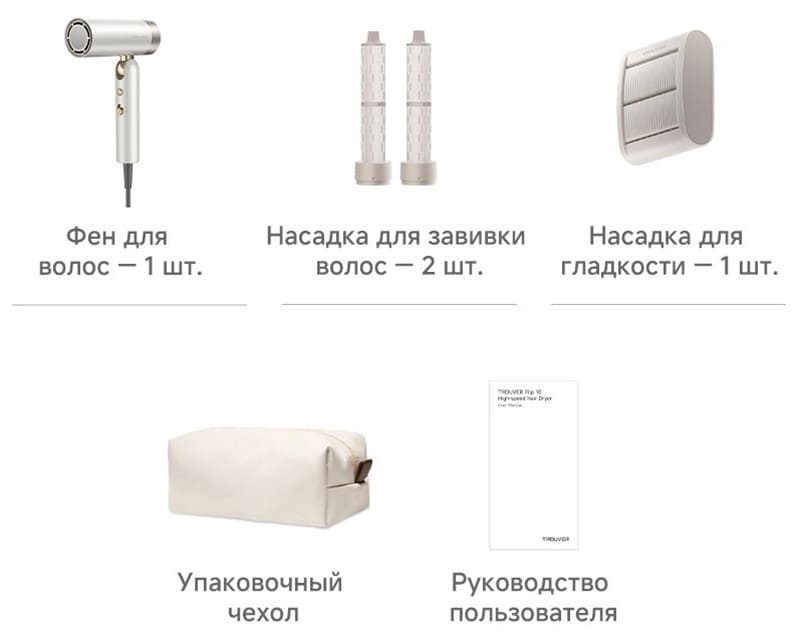 Фен для волос, насадка для завивки волос (2 шт.), насадка для гладкости, упаковочный чехол, руководство пользователя, гарантийный талон.