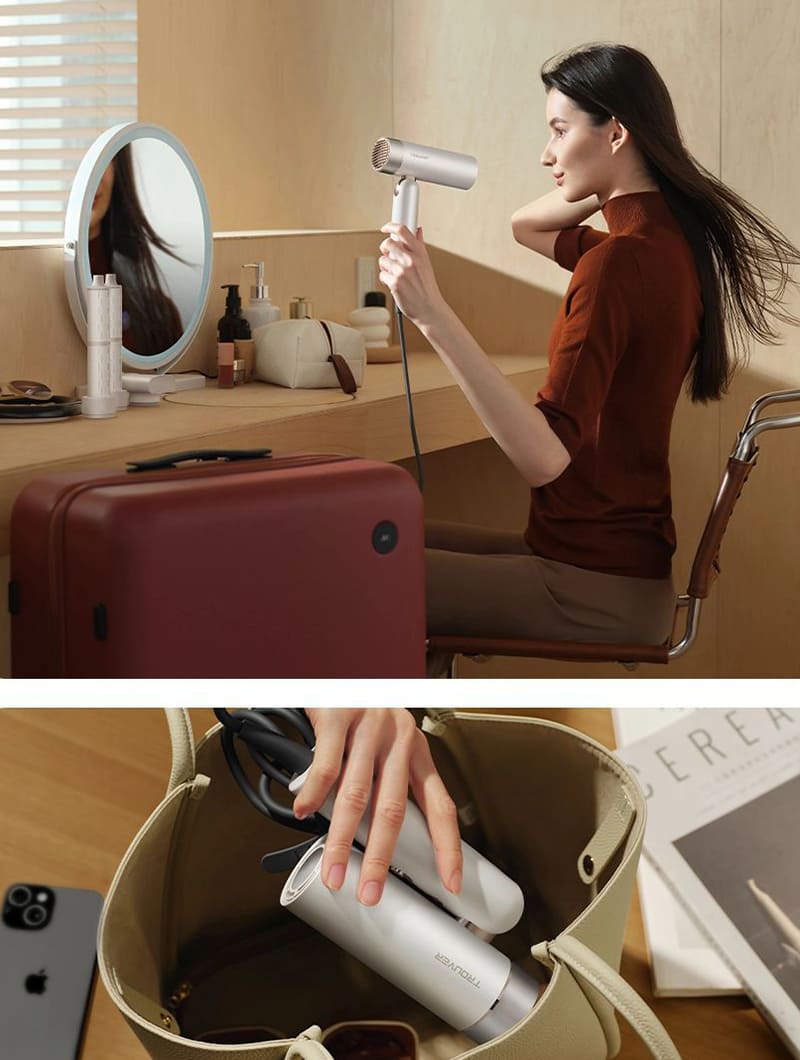 Благодаря оригинальной складной конструкции размеры фена Flip 10 в сложенном виде сопоставимы с размерами современных смартфонов. Сложенный фен не занимает много места и легко помещается на ладони, в дамской сумочке или в багаже.