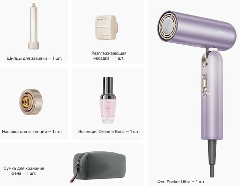 Комплект поставки Щипцы для завивки Разглаживающая насадка Насадка для эссенции Эссенция Dreame Воса Сумка для хранения фена Фен Pocket Ultra