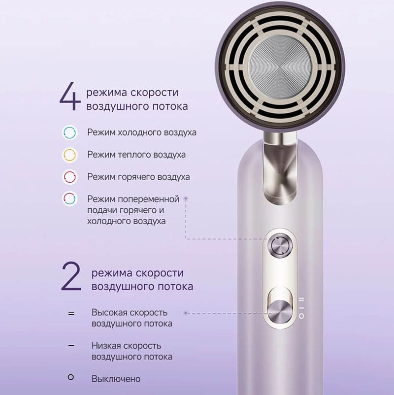 Двойные воздуховыпускные отверстия увеличивают площадь подачи воздуха и повышают равномерность распределения тепла, предотвращая перегрев и поддерживая температуру сушки стабильной. Воздушный поток, формируемый такими отверстиями, позволяет избежать теплового повреждения волос.