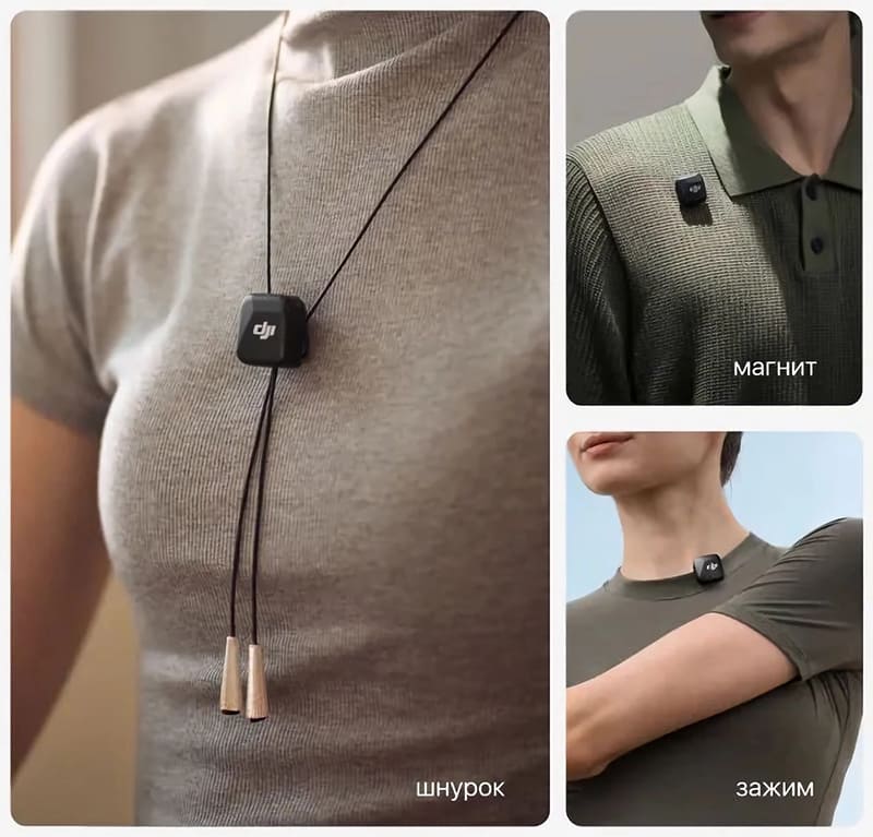 - Клипса: входящий в комплект зажим позволяет крепить передатчик к лацкану пиджака, воротнику, шарфу или сумке;