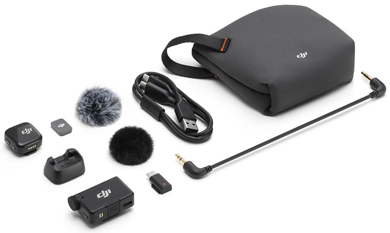 1 передатчик, приёмник, кабель для зарядки, зарядная станция для передатчика, кабель 3,5 мм TRS, адаптер USB Type-C, съёмная ветрозащита, чехол, магнитная клипса, документация, гарантийный талон.