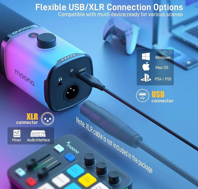 Устройство оснащено двумя интерфейсами подключения — USB Type-C (с адаптером на USB Type-A) для быстрой и простой интеграции с компьютерами и игровыми консолями, а также 3-pin XLR для подключения к профессиональному звуковому оборудованию. Это делает микрофон универсальным выбором как для начинающих пользователей, так и для опытных звукорежиссеров.