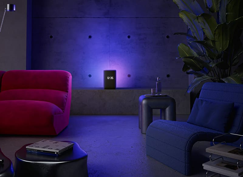 - круговая RGB-подсветка вокруг верхней панели с 16 млн цветов — реагирует на голосовые команды, покраска следит за громкостью музыки, отображает события;