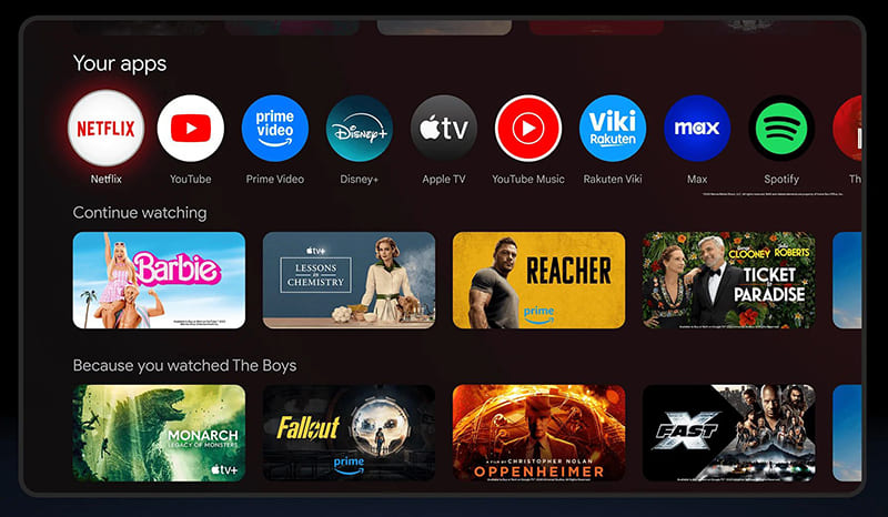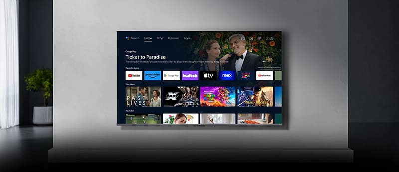 Телевизор интегрируется с Google Ассистентом для голосового поиска фильмов, запуска приложений, управления музыкой и устройствами умного дома. Управлять контентом можно простым нажатием на кнопку на Bluetooth-пульте, поддерживающем покрытие 360° и индивидуальную настройку кнопок.