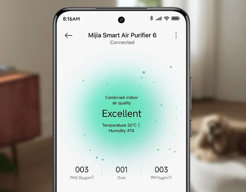 Xiaomi Mijia Smart Air Purifier 6 — это многоступенчатый очиститель воздуха для жилых помещений, предназначенный для удаления аллергенов, патогенов, летучих органических соединений и неприятных запахов. Преимущества модели — встроенный датчик PM1 для детектирования ультратонких частиц размером менее одного микрона (которые проникают в глубокие ткани лёгких), встроенный УФ-модуль для стерилизации воздуха и интеллектуальная система из пяти датчиков, которые в реальном времени мониторят качество воздуха.