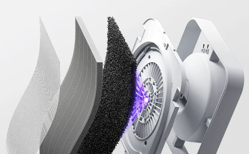 Воздух проходит через пять последовательных фильтрующих слоёв, каждый из которых удаляет определённый тип загрязнений. Первый слой — предварительный фильтр, который задерживает крупную пыль и другие макрочастицы, защищая основные фильтры от засорения. Второй слой — мельтблаун фильтр (спанбонд), специальный нетканый материал, который работает как сито и задерживает частицы среднего размера. Третий слой — HEPA-фильтр (High-Efficiency Particulate Air), высокоэффективный фильтр абсолютной очистки, который удаляет 99,97% частиц размером 0,3 микрона и больше. Четвёртый слой — активированный уголь в форме колонки, который адсорбирует (поглощает) газообразные загрязнители, включая формальдегид, толуол, аммиак и другие летучие органические соединения. Пятый слой — встроенный УФ-модуль, который облучает воздух ультрафиолетовым светом, стерилизуя бактерии и вирусы.