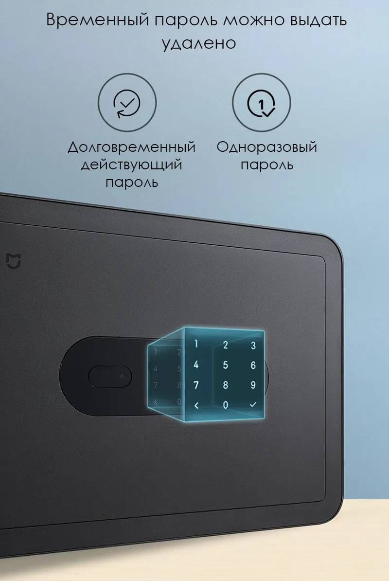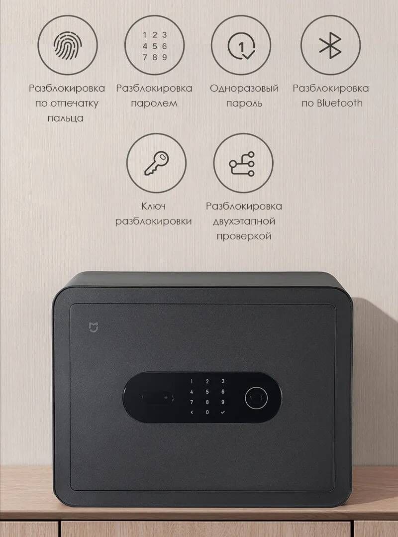 Сейф поддерживает несколько вариантов разблокировки: отпечаток пальца, основной пароль, одноразовый пароль, Bluetooth, традиционный ключ, а также двухэтапная разблокировка (например, отпечаток пальца вместе с ключом или паролем).