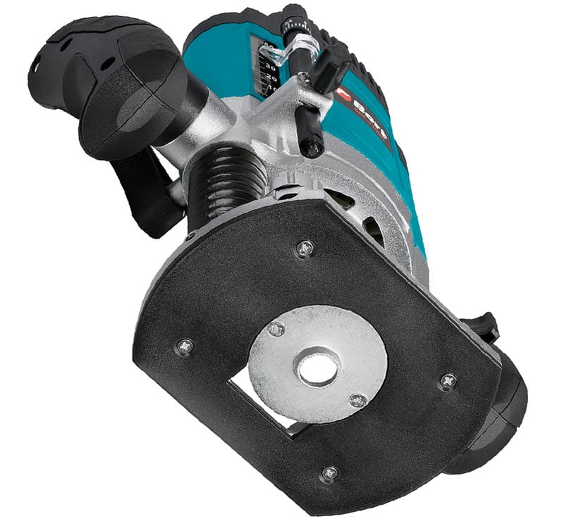 Инструмент относится к классу вертикальных фрезеров: двигатель движется по направляющим стойкам относительно подошвы, обеспечивая контролируемый «погружной» ход. Подошва выполнена из прочного металлического сплава с жёсткой геометрией, что уменьшает люфты и даёт ровное ведение по заготовке. Вес около 3,2 кг создаёт достаточное прижимное усилие к детали без чрезмерной нагрузки на руки при длительной работе.