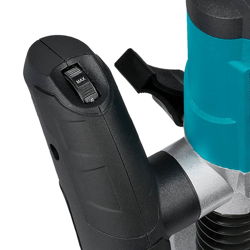 Выключатель встроен в рукоятку и фиксируется пальцами, что позволяет одновременно управлять движением по заготовке и включением/выключением. Рычаг фиксатора глубины расположен рядом с рукояткой, поэтому переход от грубой установки глубины к точной доводке занимает минимум времени. Рукоятки симметричные, что удобно как правшам, так и левшам, а центр тяжести расположен ближе к подошве, что уменьшает риск заваливания фрезера при работе на кромке детали.