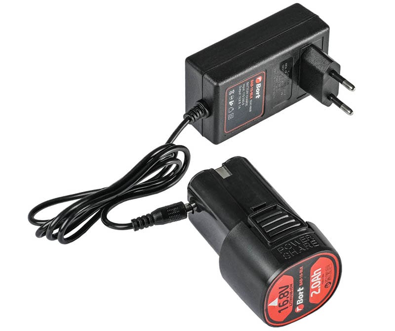 Зарядное устройство с повышенной силой тока (2 А) полностью восполняет ёмкость батареи за 2 часа. Это позволяет работать с одной батареей, пока другая заряжается, избегая простоев во время работы. Входящее в комплект зарядное устройство подключается к сети 220 В через стандартную вилку. Индикаторы на устройстве показывают процесс зарядки.