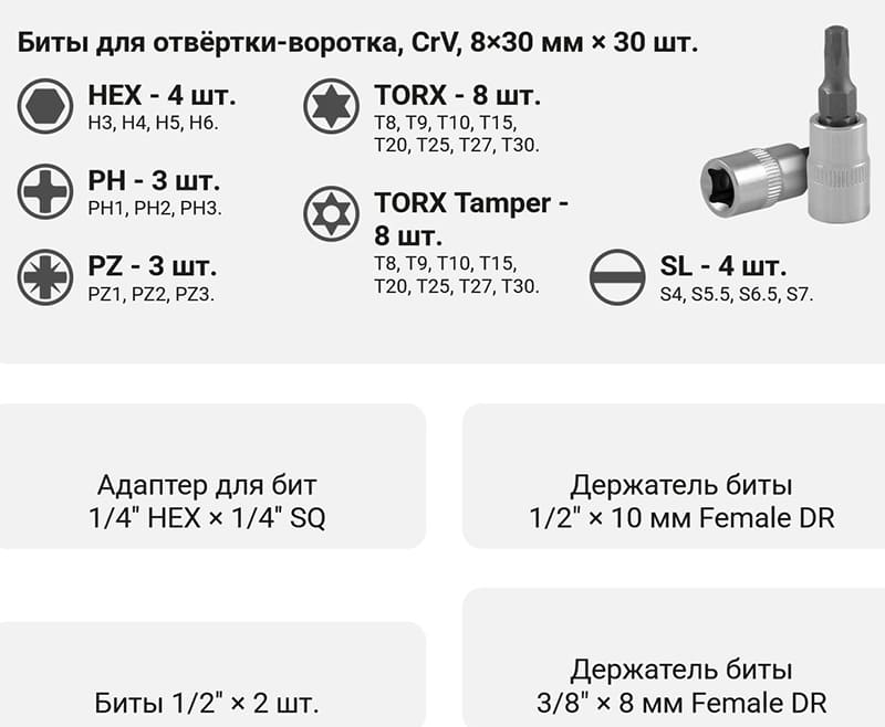 - Комплект оснащен удобными рукоятками с трещоткой для удобства работы.