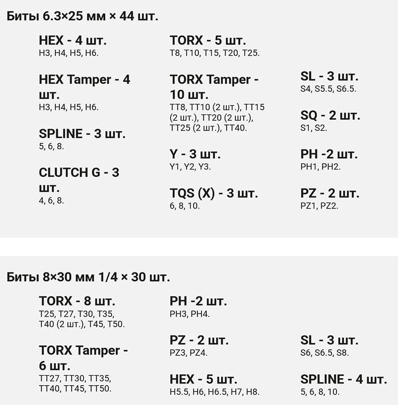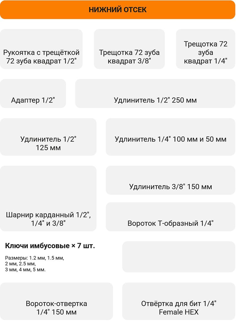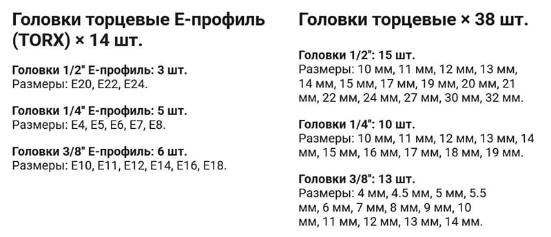 - Посадочные квадраты: 1/4", 3/8", 1/2"