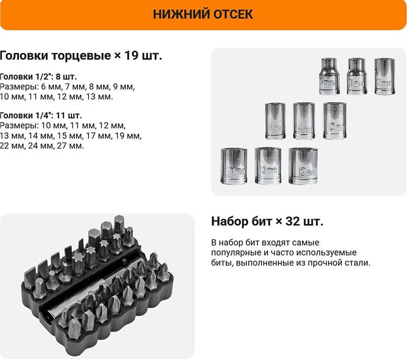 - Тип посадочного квадрата для головок: 1/4" и 1/2"