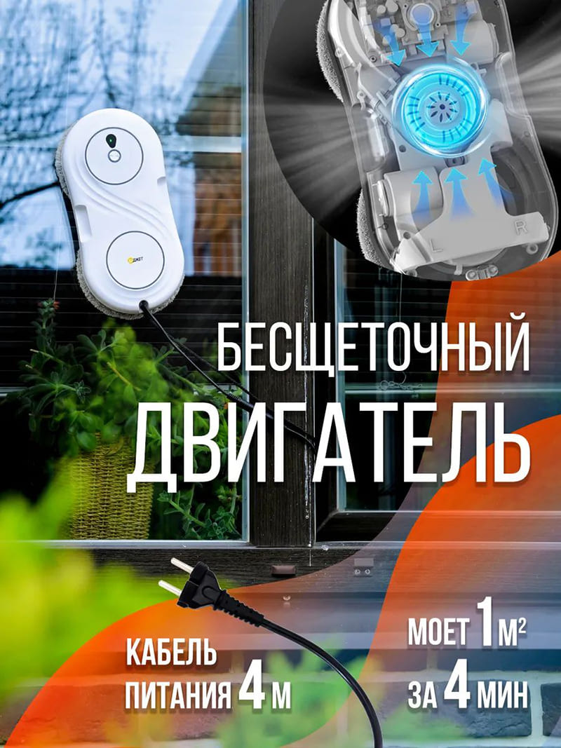 Корпус робота имеет овальную форму с двумя круглыми площадками, на которые крепятся чистящие салфетки. В центре расположен вакуумный двигатель: он откачивает воздух из-под корпуса и создает разрежение, за счёт которого робот плотно прижимается к поверхности. Такое вакуумное сцепление позволяет устройству уверенно удерживаться на вертикальном стекле и других гладких поверхностях.