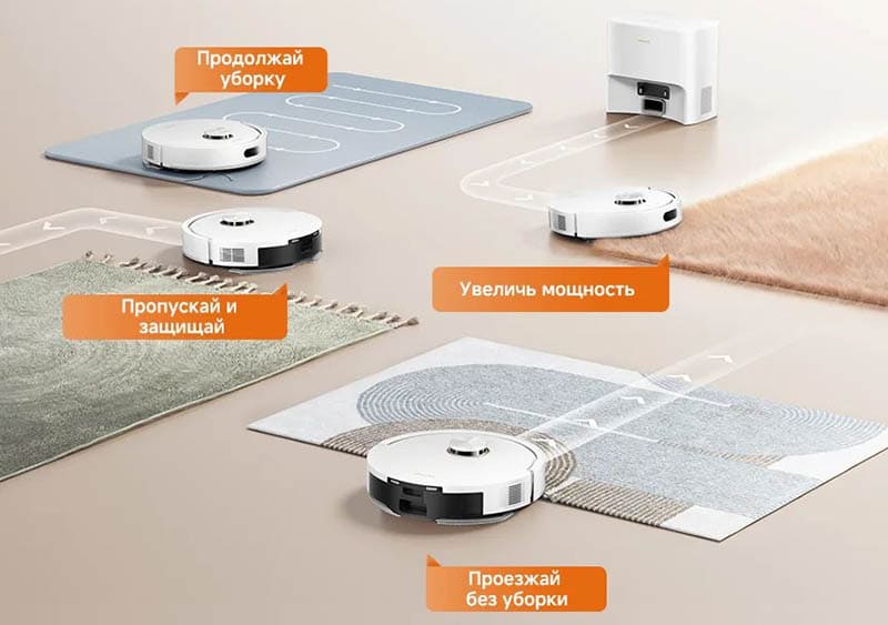 Для ковров предусмотрен отдельный режим: он помогает тщательнее собирать пыль и волосы, а настройки позволяют при необходимости объезжать ковры (это удобно, если вы запускаете влажную уборку и не хотите мочить ворс).
