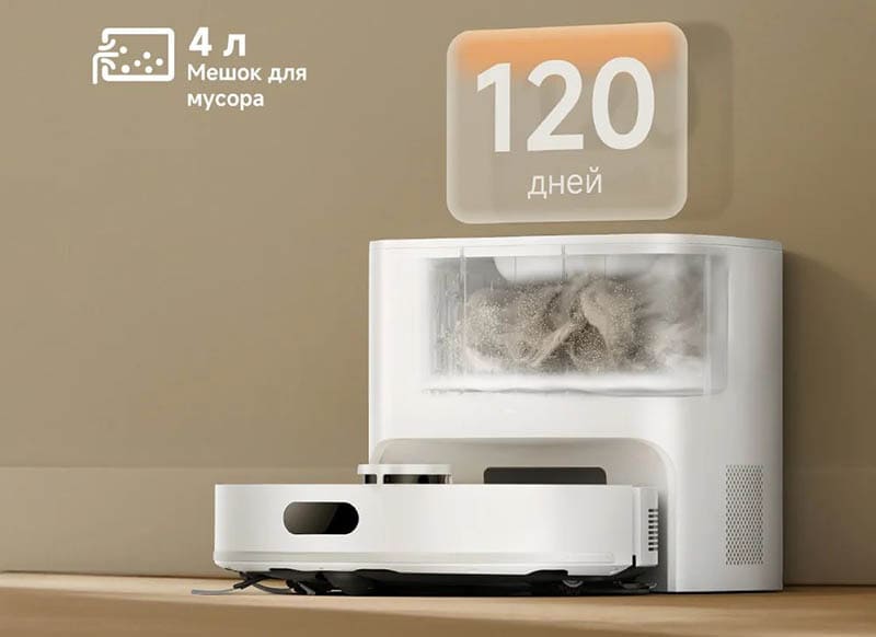 F21 Plus состоит из робота и базы самоочистки. Внутри базы установлен пылесборный мешок объемом 4 л — он принимает мусор из контейнера робота воздушным потоком. Производитель указывает до 120 дней без ручной очистки (срок зависит от площади, количества ковров, животных и частоты уборок).