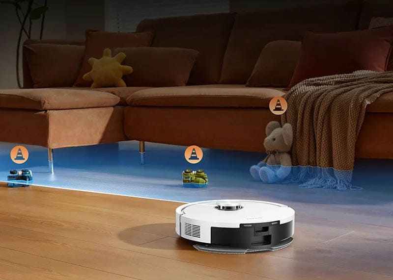 Система навигации Pathfinder сканирует пространство и строит карту для оптимального маршрута и объезда препятствий. Робот ориентируется по «скану» комнаты и уверенно работает даже при слабом освещении.