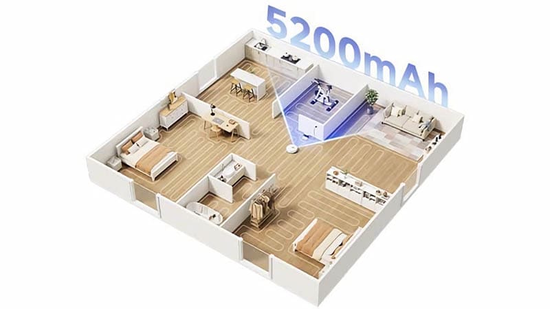 Поддержка умного дома позволяет управлять роботом голосовыми ассистентами. Аккумулятор ёмкостью 5200 мАч обеспечивает уборку до 120 м² за один цикл или около 300 м² за три подхода. Робот легко преодолевает пороги и ковры высотой до 2 см, а множество встроенных датчиков предотвращают падения, столкновения и сбои в работе.