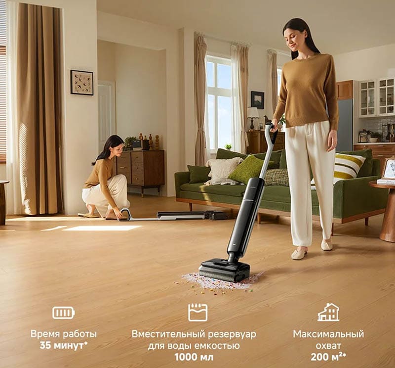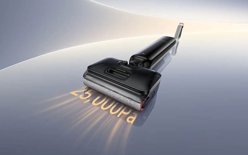 Корпус пылесоса выполнен в форм‑факторе стоящей швабры с опорой на широкую моторизованную щетку и верхним блоком с баком чистой воды, аккумулятором и системой управления. Толщина нижней части всего около 9,85 см, поэтому щетка проходит под низкой мебелью, диванами и тумбами, добираясь до пыли в труднодоступных зонах. Наклон до почти горизонтального положения (до 180°) позволяет вести уборку под кроватями и шкафами без необходимости наклоняться и перемещать мебель. Вес около 4,7 кг распределен так, чтобы основная нагрузка приходилась на пол, а руке нужно было только направлять ручку пылесоса.