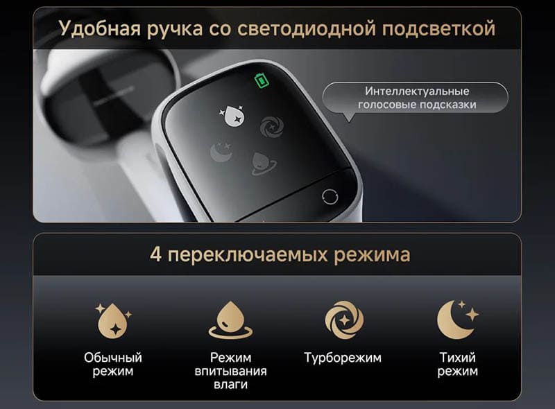 Турборежим повышает мощность всасывания и интенсивность увлажнения щетки для быстрого удаления въевшихся загрязнений, липких пятен и подсохших капель. Режим впитывания влаги акцентирует работу на сборе жидкости с пола, например, после пролитых напитков, при этом подача новой воды может быть ограничена, чтобы не увеличивать объем лужи. Все режимы переключаются с панели управления на рукоятке, а текущий статус отображается на LED‑экране, где также можно увидеть индикацию заряда и напоминания о необходимости обслуживания.