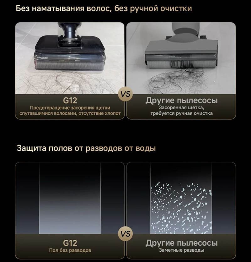 Система из двух скребков с TangleCut 2.0 и дополнительным сушащим скребком выделяет эту модель на фоне устройств, где волосы приходится регулярно снимать вручную с валика. Раздельная конфигурация бака грязной воды для вертикального и горизонтального положения позволяет сохранять защиту двигателя.
