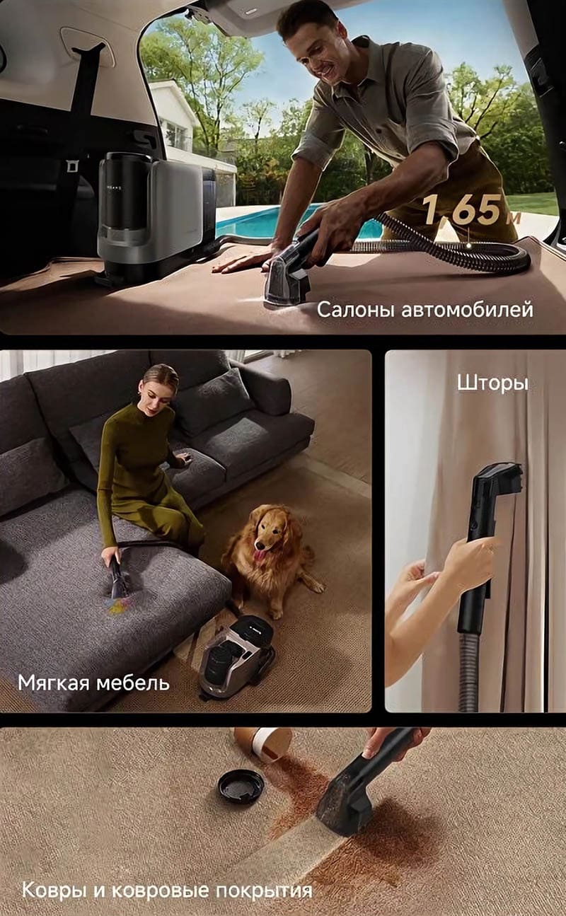 Дополнительный модуль для глубокой очистки тканевых покрытий (продаётся отдельно) с всасыванием 19 000 Па и направленным разбрызгиванием средства Dreame позволяет быстро справляться с пятнами, оставляя минимум влаги для быстрой сушки.