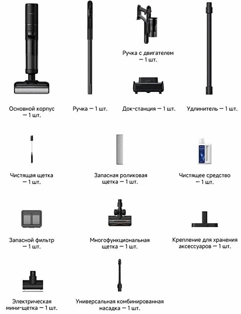 - Функциональные особенности: всасывание жидкостей, подсветка рабочей зоны, дисплей, автоматическая мойка швабры, автоматическая сушка швабры, мойка пола горячей водой