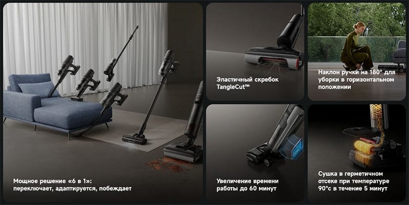 Пылесос обеспечивает до 50 минут работы в режиме влажной уборки и 60 минут — в режиме сухой, а благодаря съемному аккумулятору время работы можно удвоить, просто заменив батарею, что особенно важно при уборке больших помещений без перерывов.
