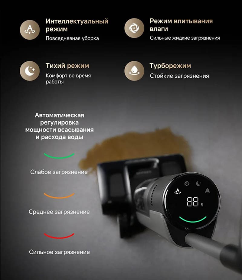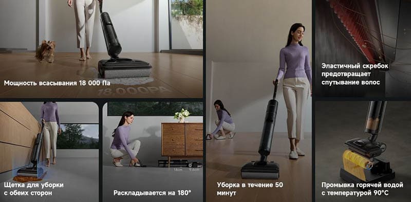 - Функциональные особенности: всасывание жидкостей, дисплей, автоматическая мойка швабры, автоматическая сушка швабры
