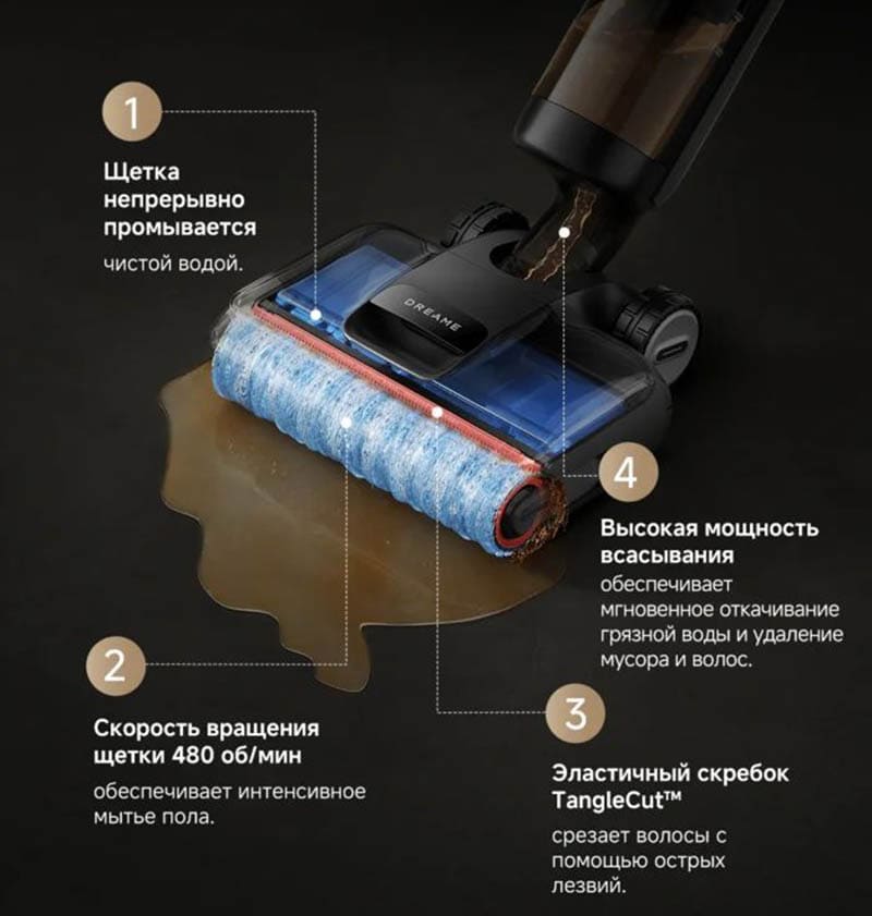 Во время мытья пола щетка непрерывно промывается свежей водой, а грязная вода быстро собирается, что повышает эффективность и уменьшает количество следов от воды.