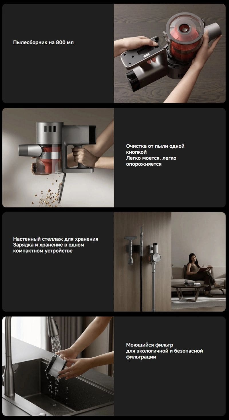 Увеличенный ресурс аккумулятора позволяет убирать весь дом на одном заряде. В эко-режиме со щелевой насадкой время работы достигает 90 минут. При использовании основной электрической щётки непрерывная уборка может длиться до 70 минут — удобно для полноценной очистки без частых пауз на зарядку.