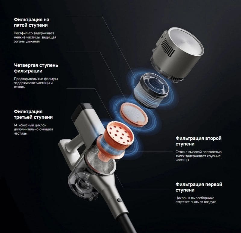 Система из 14 циклонов отделяет пыль от воздушного потока, помогая дольше сохранять производительность и снижая риск засорения фильтров. Такой принцип работы также уменьшает нагрузку на внутренние компоненты и поддерживает стабильную силу всасывания.