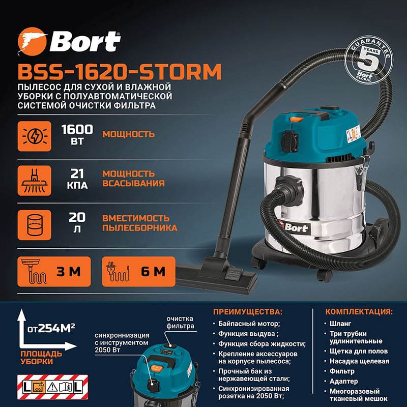 Пылесос BORT BSS-1620-STORM — универсальное и мощное устройство для эффективной сухой и влажной уборки в доме или на рабочем месте. Он отлично справляется с удалением грязи, пыли и жидкости, обеспечивая высокое качество очистки.