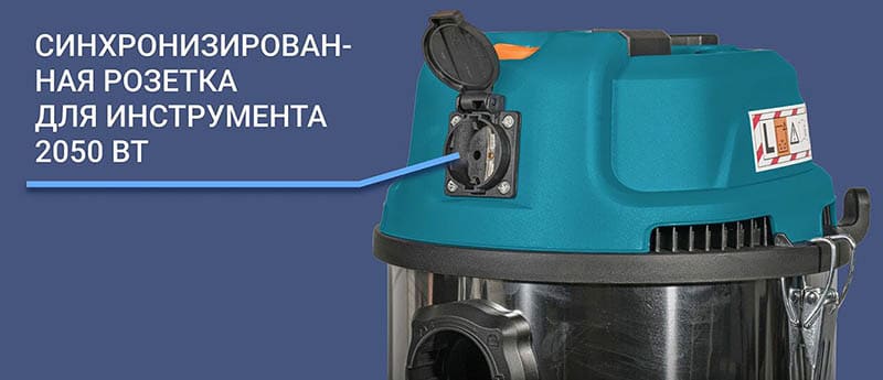 Для удобства хранения и быстрого доступа к насадкам корпус оборудован специальными креплениями. Также предусмотрена встроенная розетка мощностью до 2000 Вт для подключения электроинструментов, которая может работать как удлинитель, без активации пылесоса, что расширяет функциональность устройства.