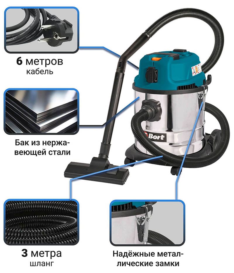 За счет функции сбора жидкости вы сможете легко и эффективно очистить любые влажные загрязнения. Пылесос BORT BSS-1620-STORM обладает большой вместимостью, имея компактный и прочный металлический бак.