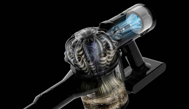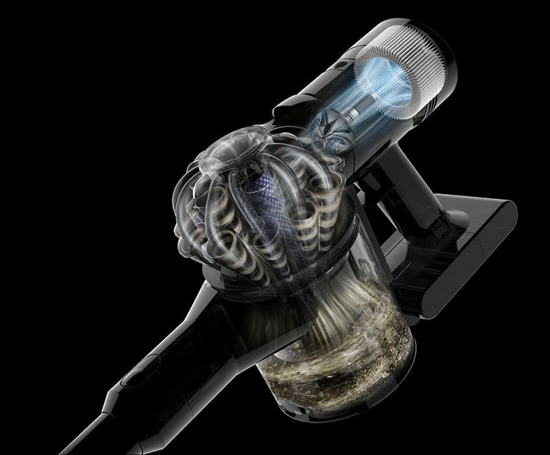 Система фильтрации состоит из двух основных компонентов. Предварительный фильтр (pre-motor filter) расположен в верхней части циклонного узла и удаляет крупные частицы прямо из воздушного потока. Этот фильтр имеет складчатую конструкцию с электростатическим слоем, притягивающим более мелкие частицы. Основной фильтр (post-motor filter) находится в нижней части корпуса и представляет собой 1,5 метра полиэтилентерефталата (PTFE), сложенного 158 раз. Эта гофрированная конструкция создаёт огромную поверхность контакта, позволяя фильтру захватывать частицы размером всего 0,3 микрона — это 100 раз меньше человеческого волоса. Вся система вместе улавливает 99,99% микроскопических частиц и аллергенов.