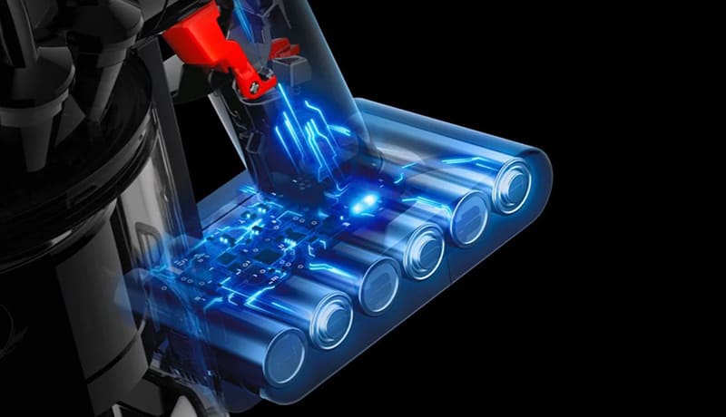Питание обеспечивает 6-ячейный энергоёмкий литий-ионный аккумулятор. Батарея обеспечивает 40 минут непрерывной работы в режиме "Powerful", или 5-7 минут в режиме "MAX". Фактическое время работы зависит от типа поверхности, количества пыли и используемых насадок. Например, режим MAX со специальной насадкой может сократить время до 5 минут, а на чистом твёрдом полу устройство может работать ближе к 40 минутам. Полная зарядка батареи занимает 5 часов.