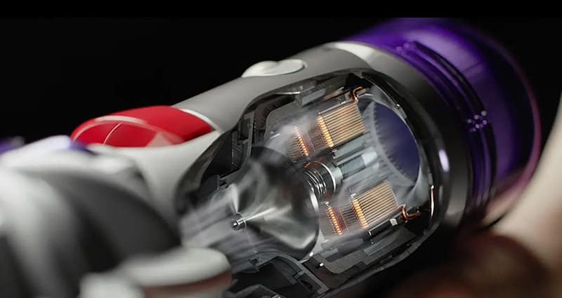 В сердце устройства работает мощный цифровой двигатель Dyson V8, вращающийся с частотой 110 000 оборотов в минуту. Этот мотор генерирует всасывающую силу 130 воздушных ватт в режиме MAX, что является самым мощным показателем среди моделей V8.