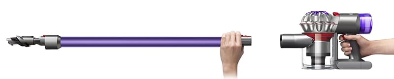 Пылесос мгновенно разделяется на две части. Верхняя половина (ручной пылесос) отсоединяется от трубы и основания одним нажатием кнопки на рукояти. В ручном режиме устройство становится компактным инструментом для чистки диванов, автомобильных сидений, ковров лестниц и матрасов.