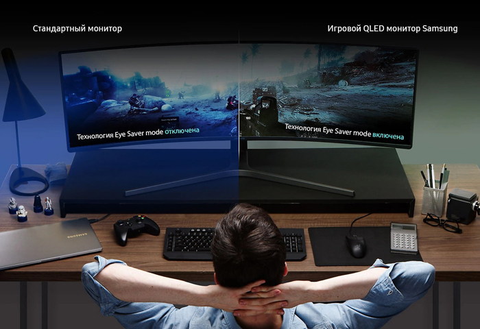- Режим Eye Saver Mode снижает нагрузку на зрение за счет снижения яркости голубого свечения.