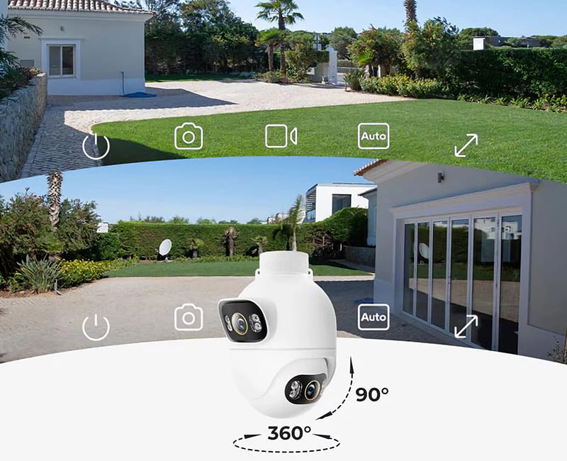 Одна камера предоставляет стабильный фиксированный обзор, вторая — с возможностью поворота на 360°, охватывая всю территорию вокруг.