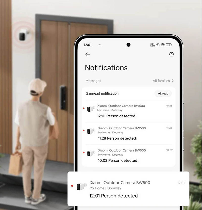 Когда человек или транспортное средство попадает в область мониторинга, немедленно раздается звуковой сигнал и включается белый свет. Помимо отпугивания незваных гостей, приложение Xiaomi Home в кратчайшие сроки отправляет владельцу предупреждающее сообщение, чтобы он мог оценить степень риска.