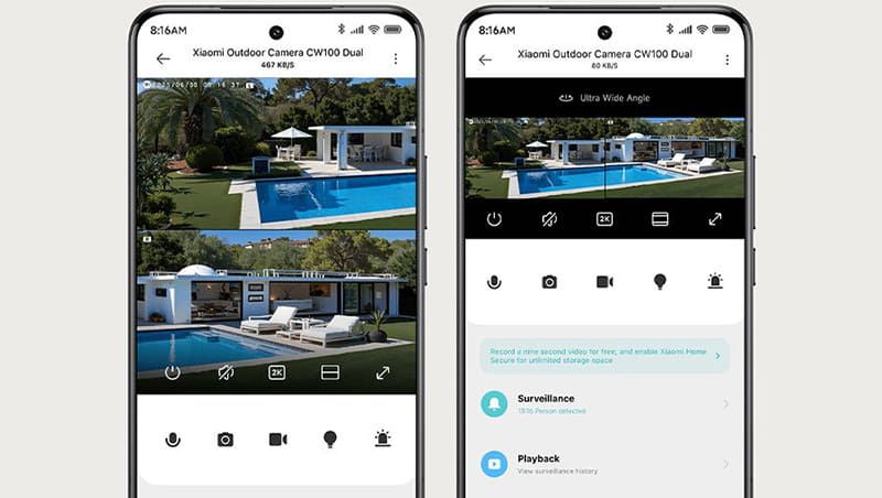 IP-камера Xiaomi CW100 Dual оснащена двумя синхронно работающими объективами, которые обеспечивают практически 180-градусный угол обзора, позволяя получать детализированную и широкую картину. Разрешение обеих объективов составляет 2304×1296 пикселей (2K) и 3 мегапикселя, что гарантирует четкое изображение. В приложении Xiaomi Home доступен просмотр объединенного двойного изображения в вертикальном или горизонтальном режиме — вы выбираете удобный формат для мониторинга гаража, сада и других крупных зон одновременно.
