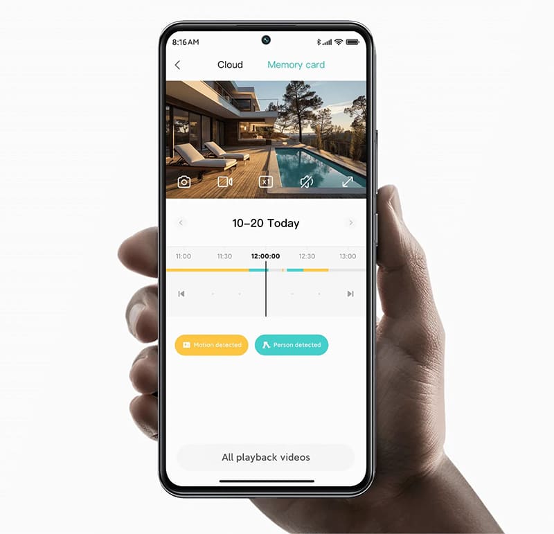 Проведите по временной шкале, чтобы с легкостью найти и просмотреть нужные видео. Для просмотра записей необходимо приобрести облачное хранилище или использовать карту microSD, которая не входит в комплект поставки.
