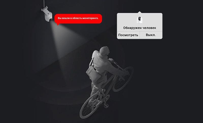 Когда камера обнаруживает человека в зоне наблюдения, она автоматически включает звуковой сигнал с миганием ламп, что позволяет отпугнуть потенциальных злоумышленников. Кроме того, она будет одновременно отправлять тревожное сообщение в приложение Mi Home / Xiaomi Home.