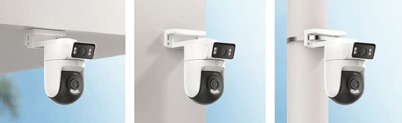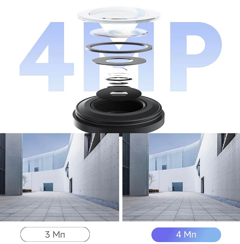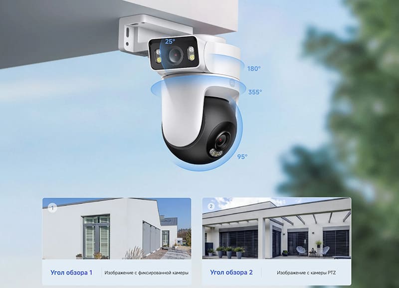 Устройство оснащено двумя объективами с разрешением 4 Мп (2560×1440 пикселей) каждый, что обеспечивает картинку формата 2.5K. Верхний модуль зафиксирован статично и отвечает за постоянный мониторинг выбранного сектора. Нижний модуль оснащен поворотным механизмом с углами обзора 355 градусов по горизонтали и 95 градусов по вертикали. Оба объектива имеют светосильную диафрагму f/1.6, что позволяет матрице захватывать больше света и формировать четкое изображение даже в сумерках.