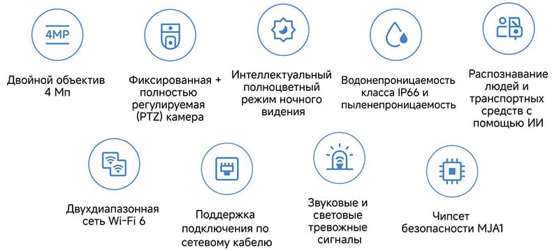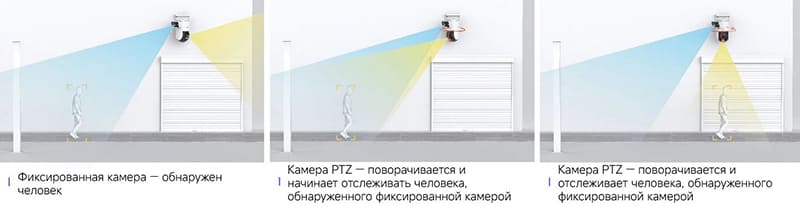 Работа двух камер синхронизирована программно. Когда в поле зрения стационарного объектива появляется человек или автомобиль, нижний поворотный модуль автоматически фокусируется на объекте и начинает его сопровождение (трекинг). Встроенный нейросетевой процессор различает типы объектов, фильтруя ложные срабатывания на движение веток, насекомых или смену освещения. Приложение позволяет просматривать видеопоток с двух камер одновременно на одном экране.